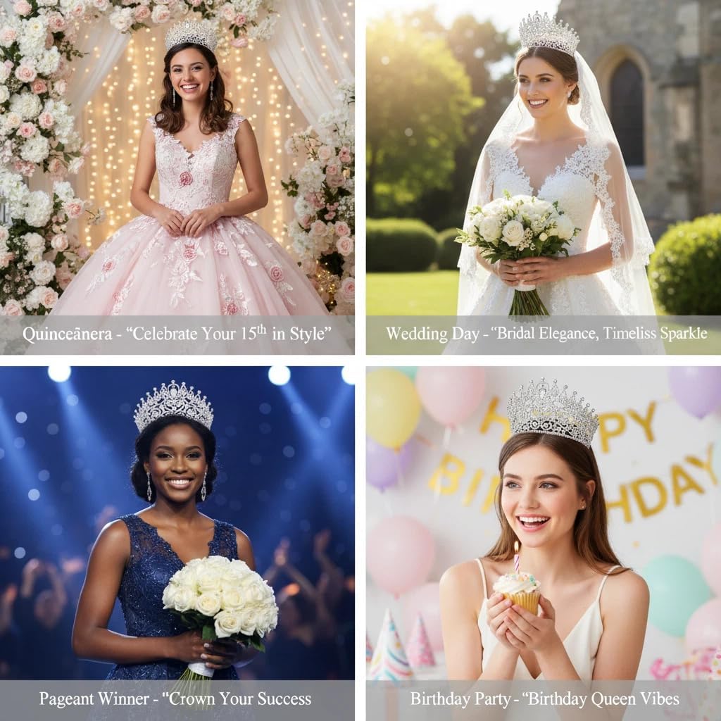 Size: Type A: Diameter: 6.7 inches; Height: 5.8 inches; Weight: 357 g. Type B: Diameter: 6.7 inches; Height: 5.0 inches; Weight: 410 g. Type C: Diameter: 6.3 inches; Height: 4.3 inches; Weight: 177 g. Type D: Diameter: 5.9 inches; Height: 4.5 inches; Weight: 197 g. Type E: Diameter: 6.7 inches; Height: 5.2 inches; Weight: 225 g. Type F: Diameter: 6.7 inches; Height: 4.4 inches; Weight: 268 g. Introducing our stunning collection of Headbands, featuring Extra Large Tiaras and Tall Pageant Crowns for Women. Crafted using the finest Austrian crystal and exuding elegance, our Clear Austrian Crystal Tiara is the perfect addition to any outfit. This silver Homecoming Queen Crown is adorned with sparkling rhinestones that catch the light at every angle, making it perfect for special occasions like birthday parties, prom nights, Quinceanera and weddings. Our collection of beauty pageant crowns for women are specifically designed to make you stand out in the crowd. Tall tiaras for pageant are perfect for those moments when you need to make a statement. Our large pageant crowns are perfect for beauty queens who desire an exquisite, yet affordable, addition to their jewelry collection. Corona Miss Universo is the perfect addition to any international beauty pageant outfit, while Coronas de Quinceaneras Altas adds a traditional touch to any quinceanera outfit. Our Coronas de Reinas Grandes are sure to make you feel like royalty. Our extra-large tiaras and tall pageant crowns are versatile and can be worn by women of all ages. Don't settle for anything less than the best - choose our large Tiaras Tall Pageant Crowns for Women Clear Austrian Crystal Tiara Silver Homecoming Queen Crown Big Rhinestone Headpiece.