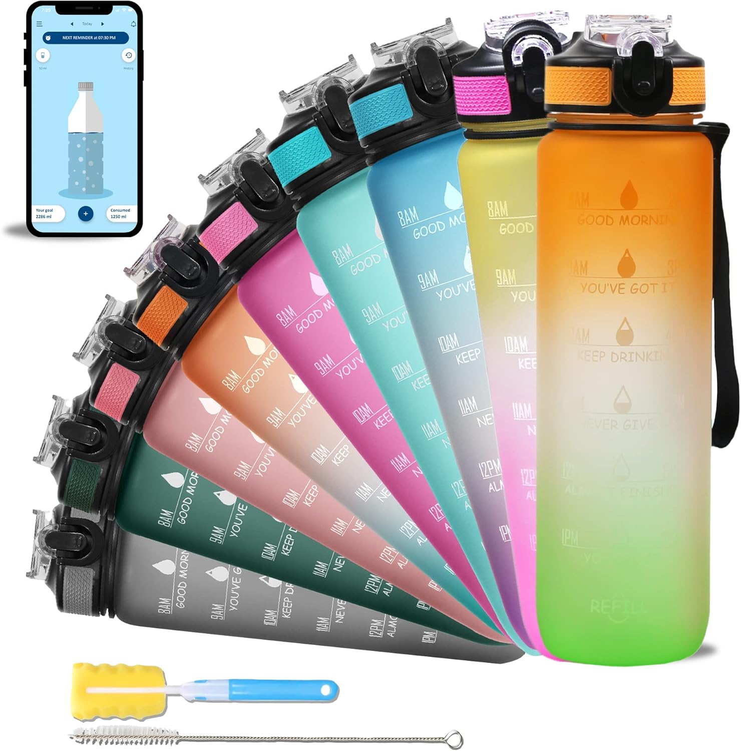 • 💦 【 WHAT YOU GET 】- 1 Tritan Motivational Water Bottle, Cleaning Brush, SOLARA Home Mobile app (iOS/Google Play store) with Drinking water reminder and SOLARA Promise.